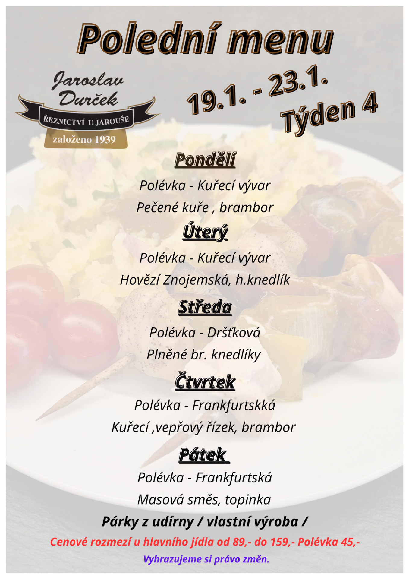 Hledáte místo v Litoměřicích, kde si pochutnáte na čerstvém domácím obědě? V Řeznictví & bistru Jaroslav Durček pro vás každý den vaříme obědy z kvalitních surovin přímo u nás na provozovně.